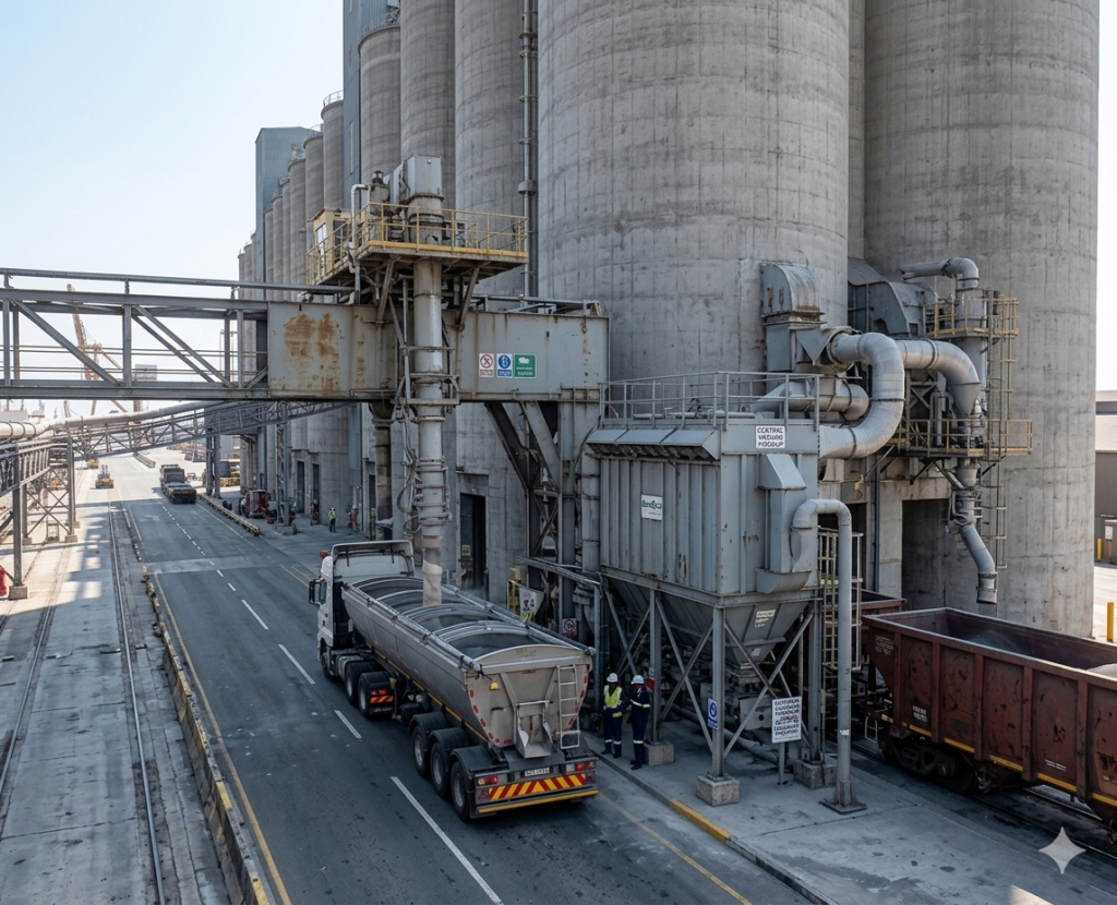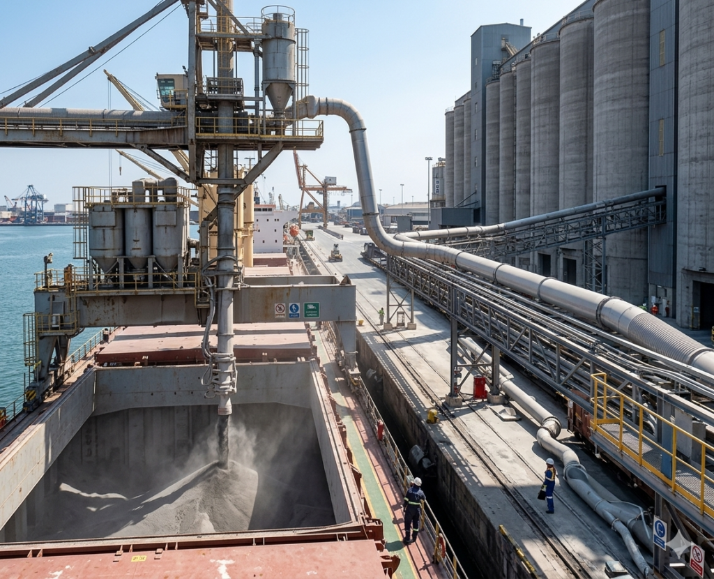 Terminal throughput depends directly on the speed and efficiency of inter-modal bulk transfer — from ship hold to terminal silo, from silo to rail wagon, from rail to road bulker. Dust generation during these operations is both a compliance risk and a product loss problem, making enclosed pneumatic conveying the preferred technology for fine dry bulk handling at terminals.
