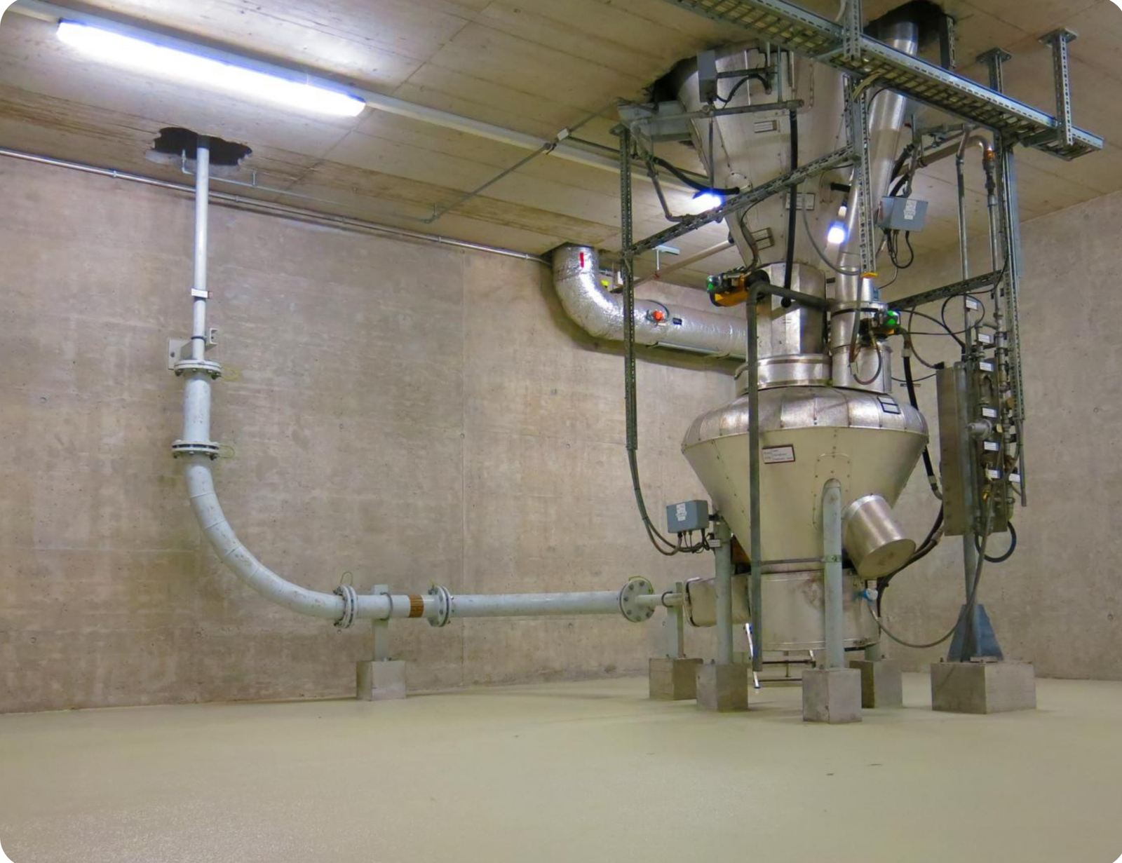 Engineering outputs include: conveying velocity selection, pipeline sizing, pressure drop calculation, vessel sizing, compressor or blower selection, and valve selection. All calculations follow established fluid-particle mechanics principles. For dense phase systems, the STAG AG pipe-in-pipe design — which reduces air consumption by 15–20% compared to conventional dense phase configurations — is evaluated as part of the engineering optimisation process.